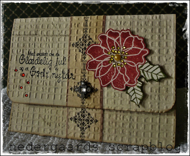 Tekststemplet fra Scrapper er stemplet direkte på pungen, men det vil jeg ikke anbefale, men her kunne jeg jo ikke lave det om. Til blomsten har jeg sværtet med -fired brick- direkte på stemlet og bladene er malet med memento markers, også på stemplet, før jeg stemplede på papiret.